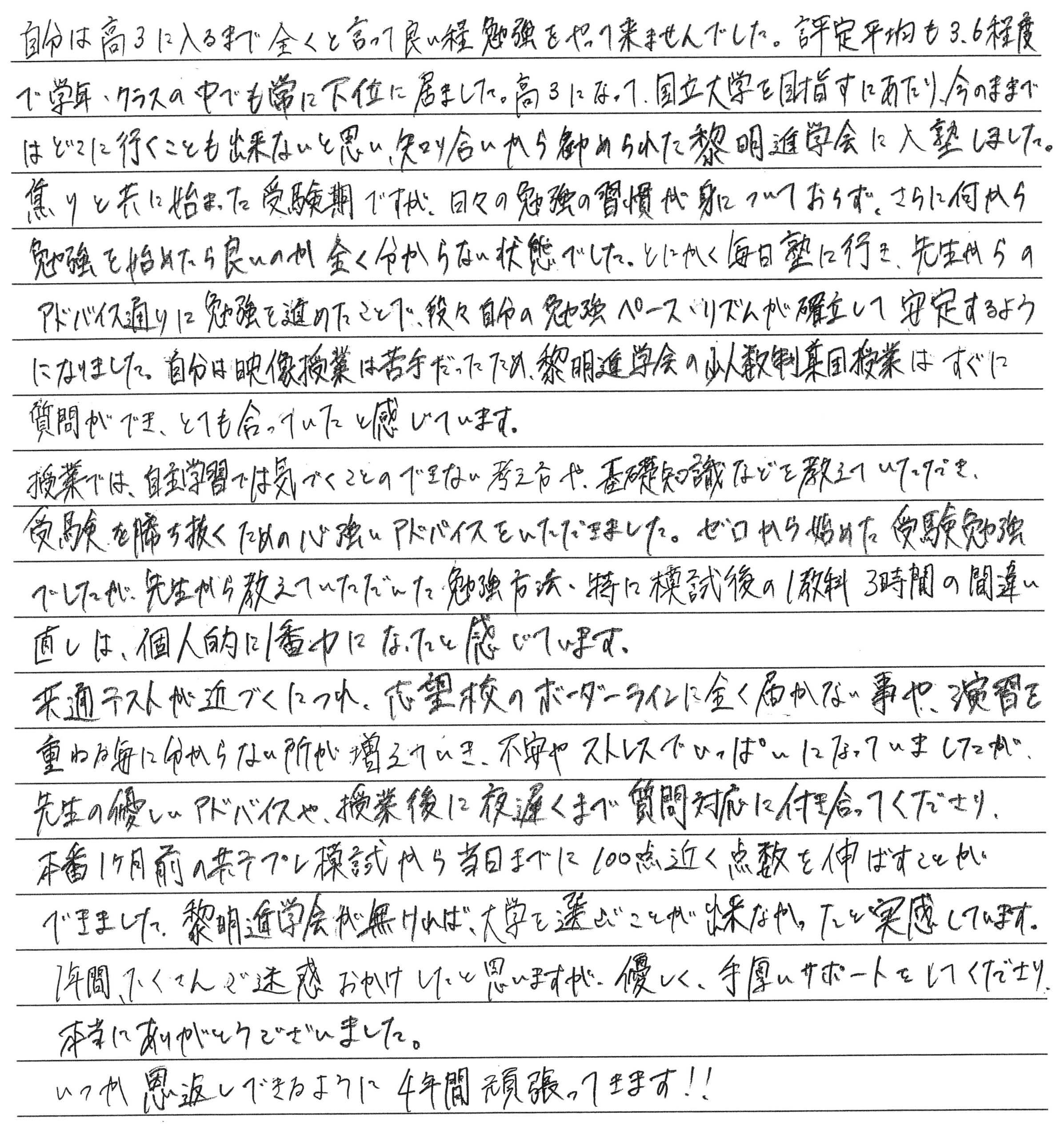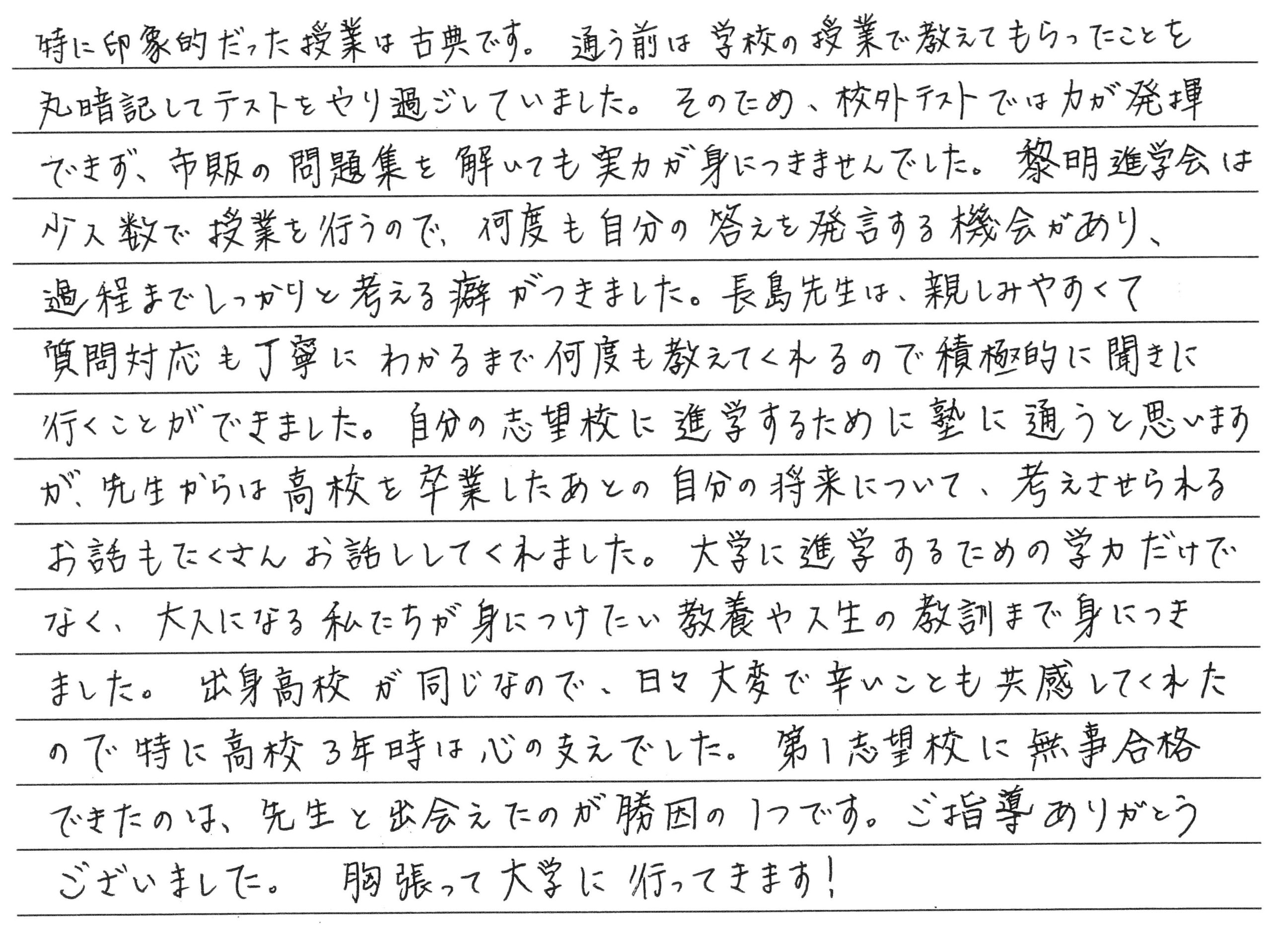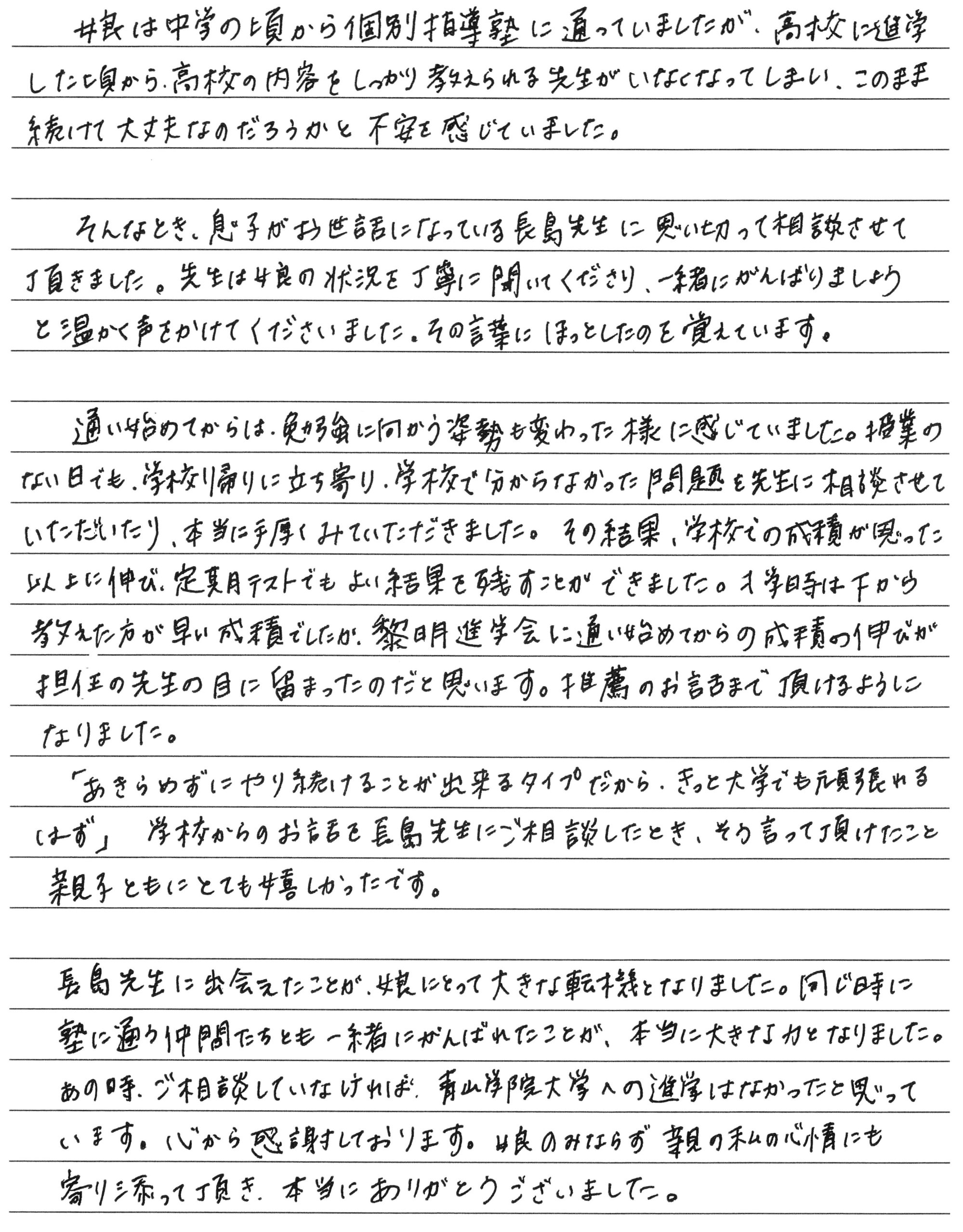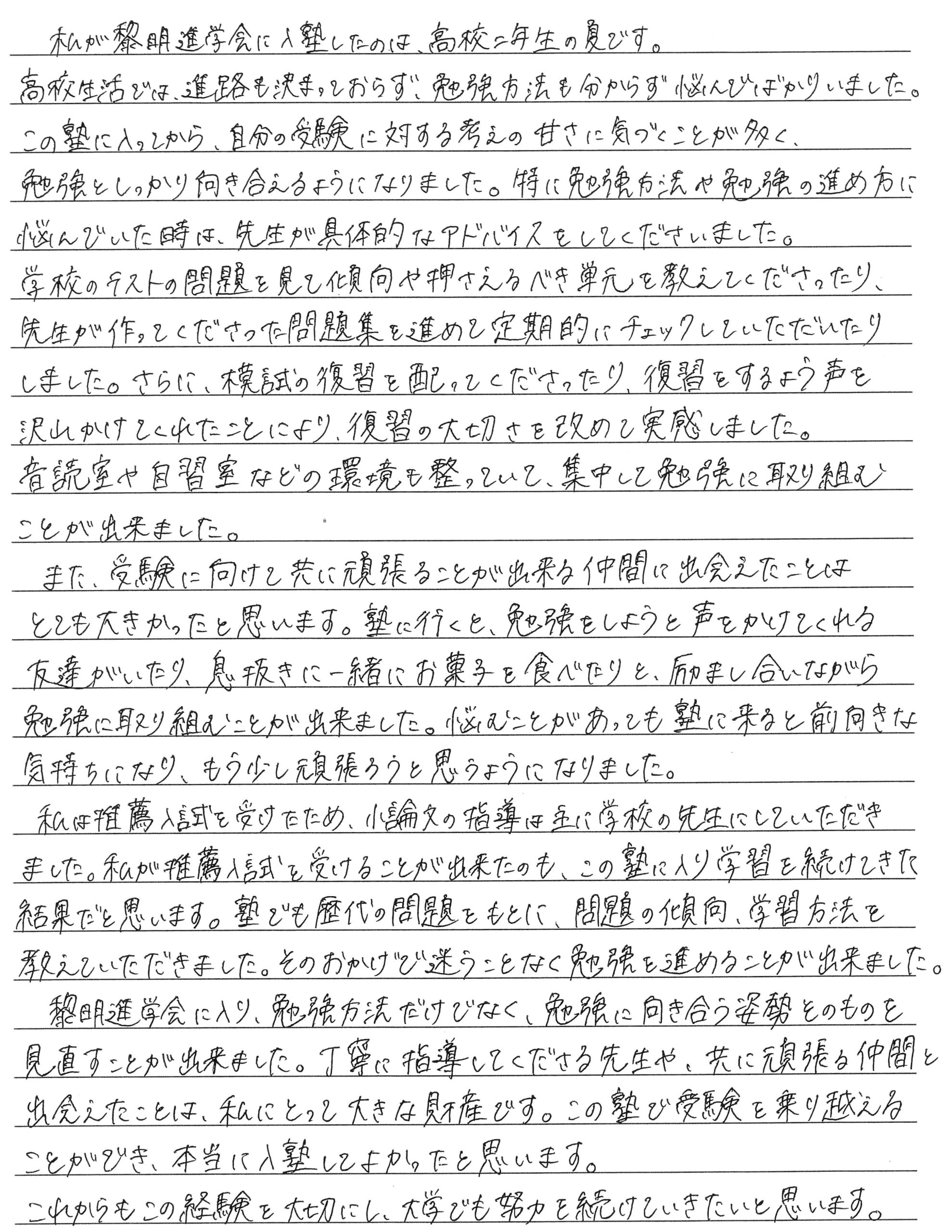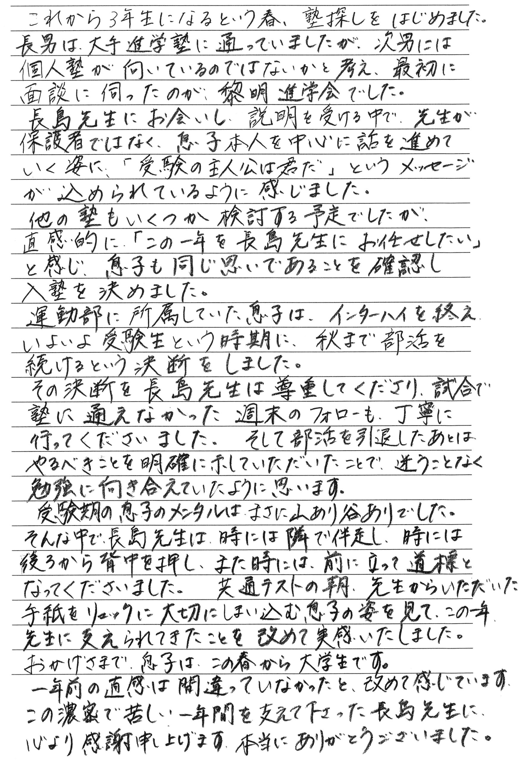 卒塾生と保護者の方からメッセージをいただきました トップページ 新着情報 卒塾生と保護者の方からメッセージをいただきました この春、大学進学を決めた卒塾生と、その保護者の方々からメッセージを頂戴しました。皆様、合格・進学、おめでとうございます。 卒塾生のメッセージは「こちら」から、保護者の方の声は「こちら」からも見ることができます。教室の様子を知る一助としてください。 卒塾生の声 Mさん Oさん Aさん 保護者の方の声 お母様 お母様 ← 新高校3年生・2年生の保護者会を行いました